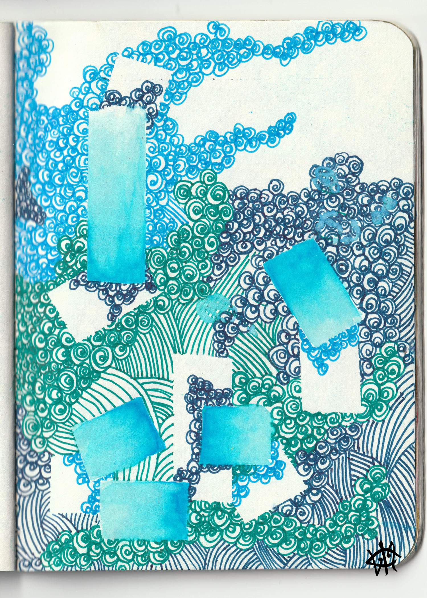 This new exploration is an evolution of a long standing play between space and dimension. For this one, I masked areas at random covering as much as possible, filling with either a solid color or pattern. I used washi tape as my mask and filled in the solid color in areas that were showing. Then as I peeled the washi tape off, I revealed the covered areas, filling them with patterns one by one. Of course, there is much more I’d like to explore with this method. I am thoroughly tickled and enthralled by where it’s headed.